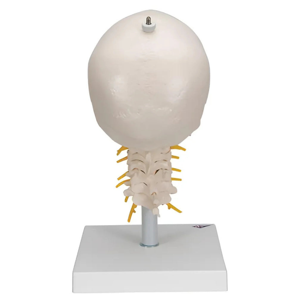 Este modelo anatómico combina un cráneo humano desmontable con una columna cervical flexible, ofreciendo un recurso altamente detallado para el estudio de la anatomía craneocervical. Además de las estructuras óseas, se representan el rombencéfalo, la médula espinal, los nervios cervicales, las arterias vertebrales, la arteria basilar y las arterias cerebrales posteriores, lo que permite un análisis integral de la relación entre huesos, sistema nervioso y vascularización.