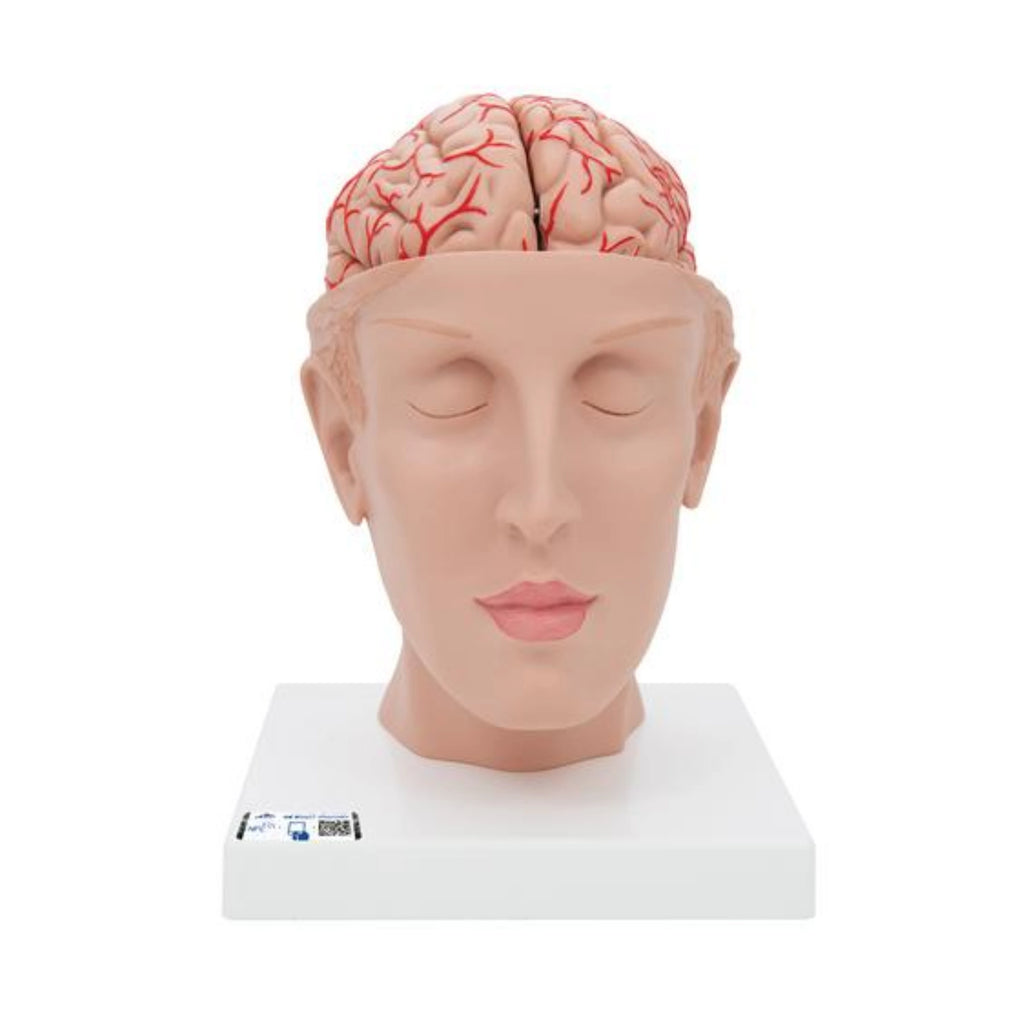 Este modelo anatómico ofrece una visión detallada del encéfalo humano y su irrigación arterial, montado dentro de una cabeza abierta que permite estudiar su posición anatómica en el cráneo. Es ideal para la enseñanza avanzada de neuroanatomía y neurología clínica.