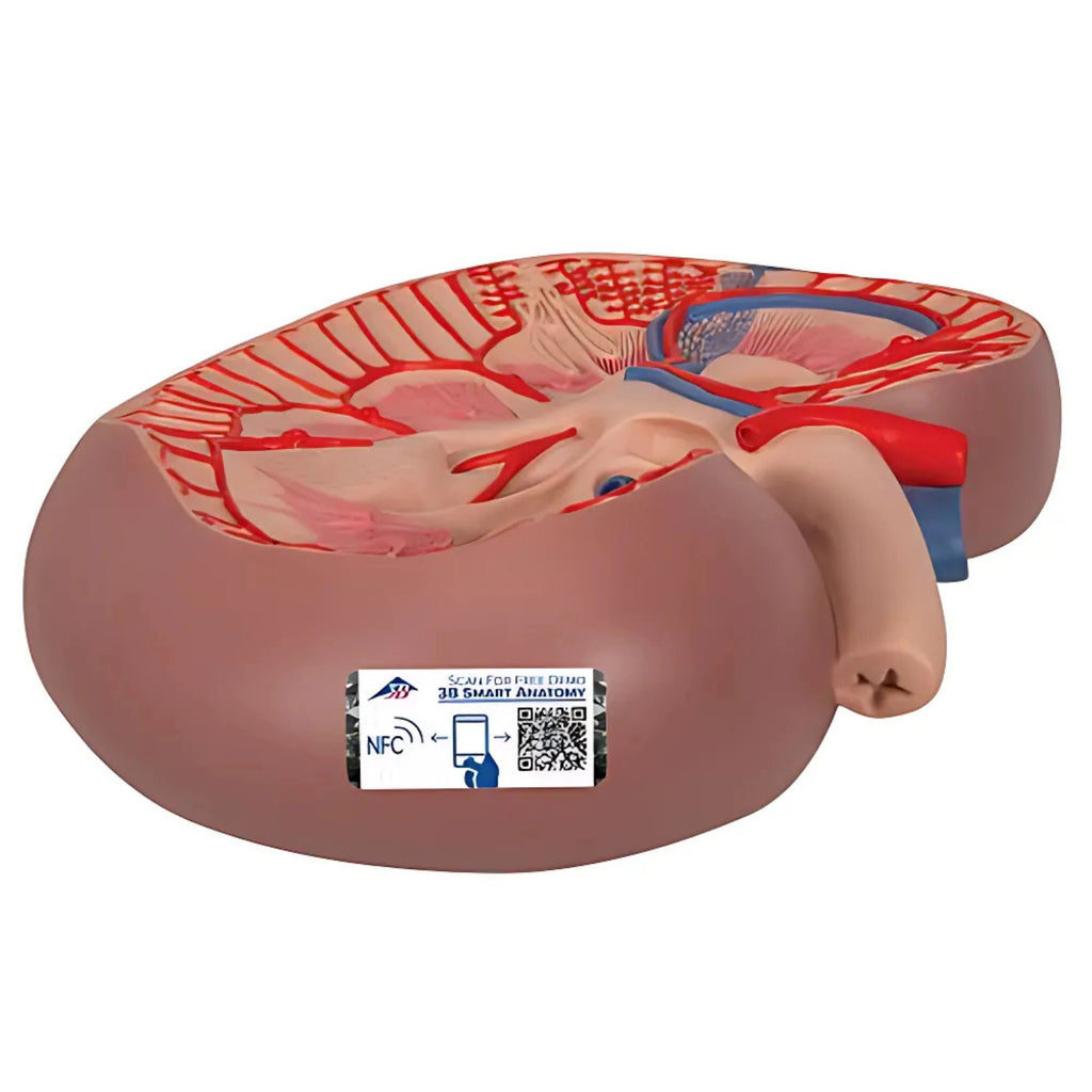 Modelo anatómico que muestra una sección longitudinal del riñón derecho a 3 veces su tamaño natural, representando de manera clara y detallada todas las estructuras internas más importantes para la enseñanza y comprensión de la anatomía renal.
