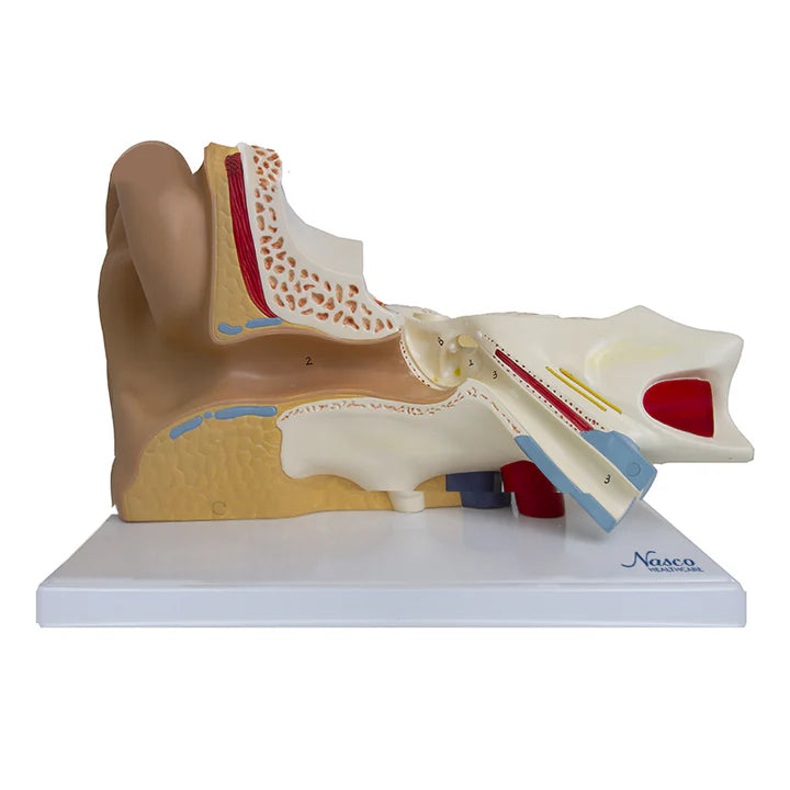 Modelo anatómico ampliado a tres veces el tamaño real, diseñado para mostrar con precisión la anatomía del oído externo, medio e interno. Sus piezas desmontables permiten estudiar cada estructura de forma detallada, facilitando la comprensión de la audición y el equilibrio.